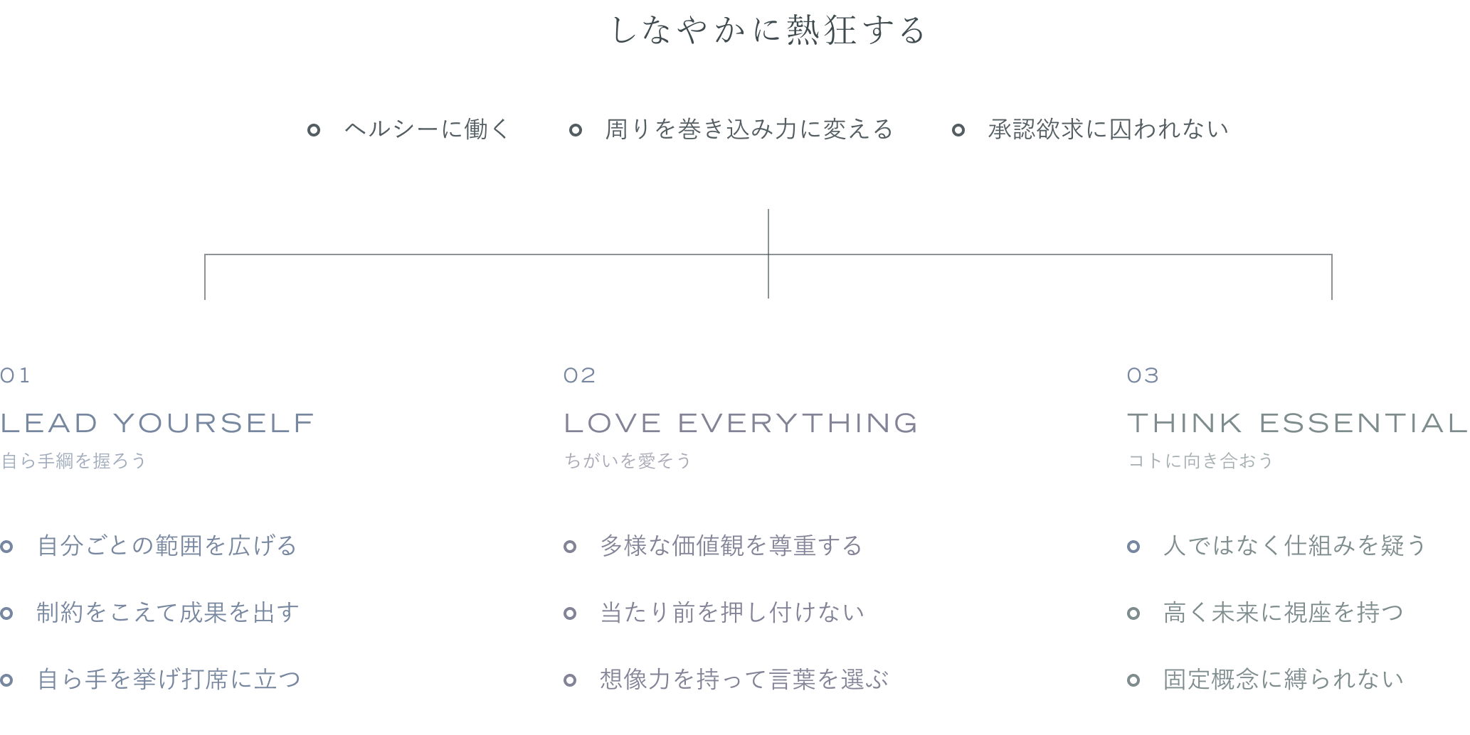 SHEでは、働くメンバーがサステナブルに幸せを追求していけるように、核となる指針に基づいた組織づくりをしています。